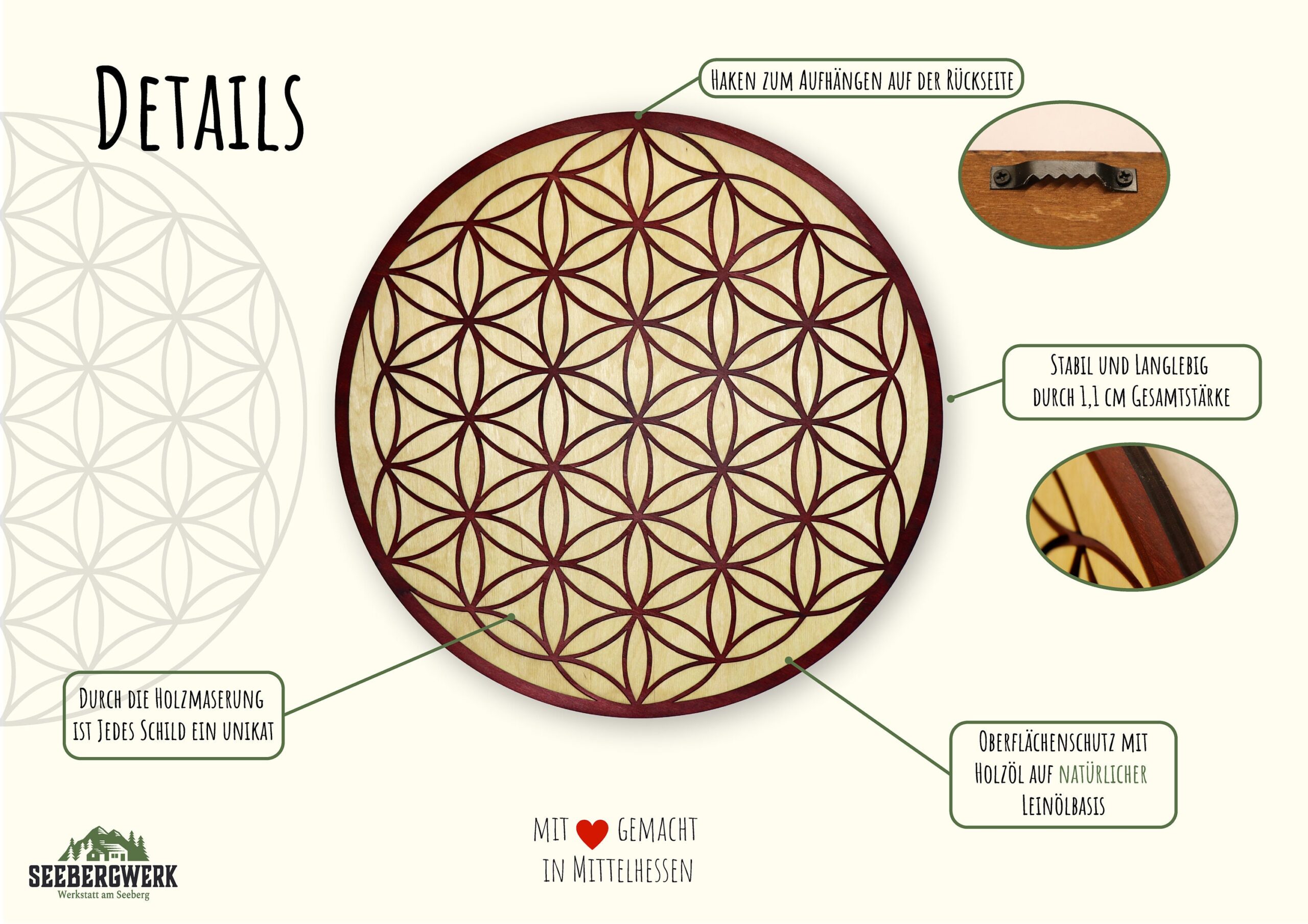 - Alle Einzelteile werden von Hand sorgfältig aufgeklebt, um die perfekte Form der Blume des Lebens zu garantieren