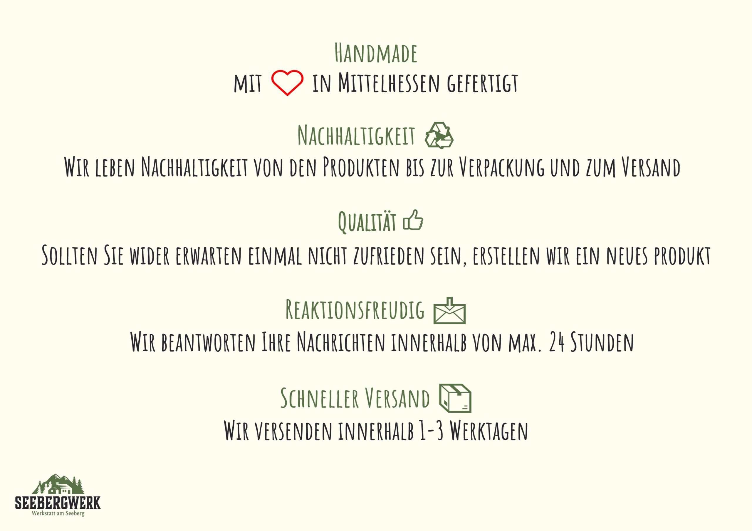 🌲 Einzigartige Unikate: Jedes Produkt wird auf Bestellung gefertigt. Kleine Unterschiede in der Holzmaserung machen jedes Stück zu etwas Besonderem.